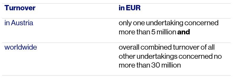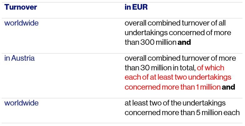 The combined national turnover threshold of more than EUR 30 million achieved in Austria now requires as addendum at least two undertakings concerned to have a turnover of more than EUR 1 million each in Austria.